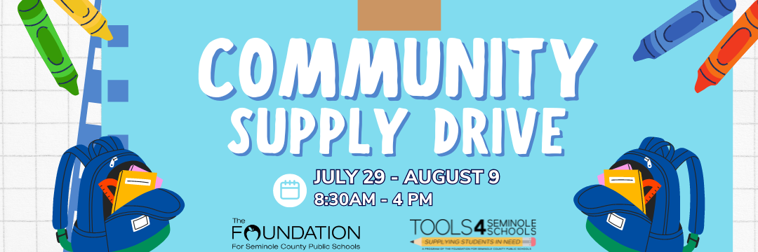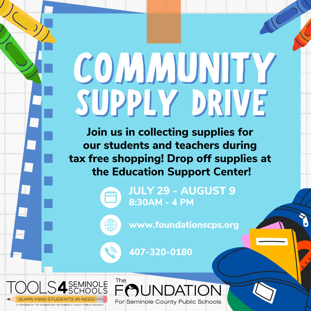 The start of school is right around the corner! As we gear up for the new school year, we will be hosting a supply drive during Tax-Free Weeks to collect essential school supplies and classroom materials for our Tools 4 Seminole Schools program.