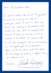 The opportunity to receive a scholarship really does make a difference to our students. One recipient wrote in a thank you letter, “I want to thank the donors for investing in my education and career. I also want to recognize the amount of faith you all have in me to succeed in the future.” Thank you to our generous donors who make this such an impactful experience for our seniors! We hope to continue growing this program each year.